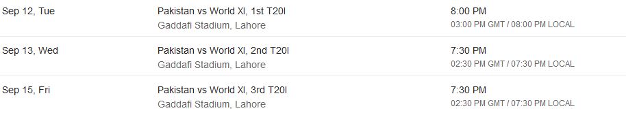 Here you can check the all cricket matches schedule of Pakistan vs World Eleven. [caption id="attachment_7389" align="aligncenter" width="710"] Pakistan and World XI Matches Schdule 2017[/caption]