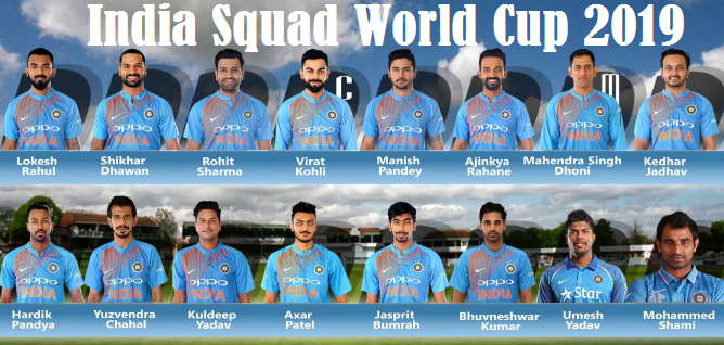 Virat Kohli (captain), Rohit Sharma (vice captain), Shikhar Dhawan, Lokesh Rahul, Vijay Shankar, Mahendra Singh Dhoni(wicketkeeper), Kedar Jadhav, Dinesh Karthik, Yuzvendra Chahal, Kuldeep Yadav, Bhuvneshwar Kumar, Jasprit Bumrah, Hardik Pandya, Ravindra Jadeja, Mohammed Shami