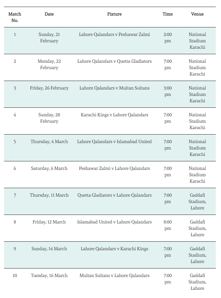 The PCB’s issued complete Lahore Qalandars Schedule For PSL 2021 is given below: