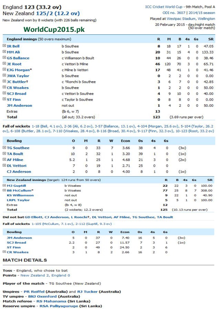 Here is New Zealand vs England World Cup 2015 9 ODI match Scoreboard: