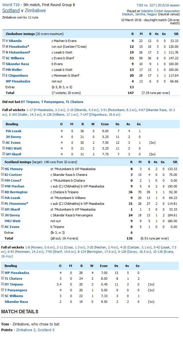 On Thursday, 10 March 2016 at Nagpur Zimbabwe and Scotland have played T20 match of ICC T20 World Cup 2016. Zimbabwe won this match by 11 runs and here is full scorecard of ICC Zimbabwe vs Scotland.